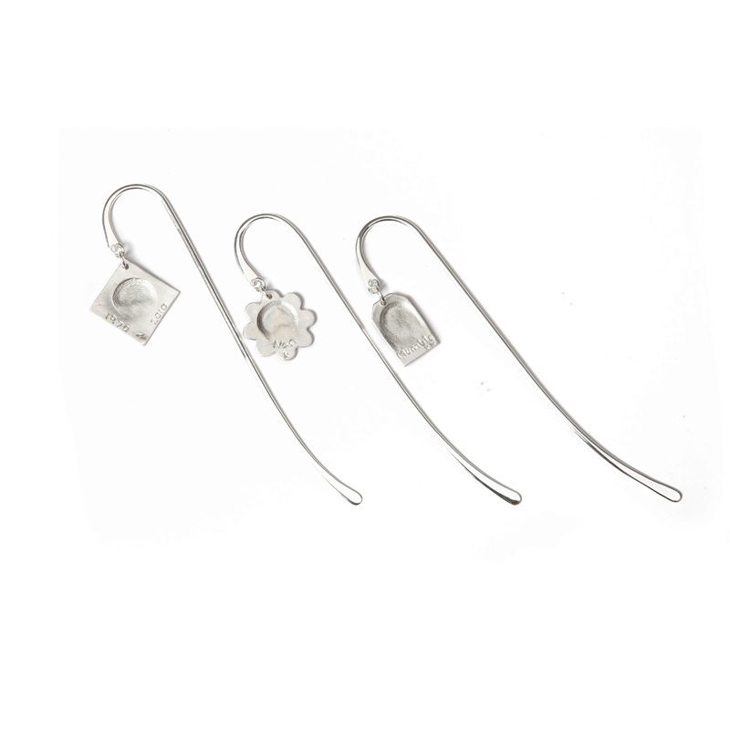As with all products, there is a choice of shapes for Charms for Bookmarks – circle, oval, heart a (symmetrical), heart b (asymmetrical), square, diamond, rectangle, tear drop, dog tag and flower. All finished on a sterling silver bookmark measuring approx. 12cm/5” tall.