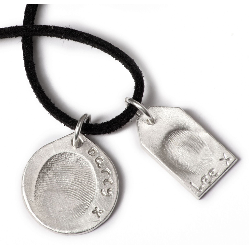 ‘Dog Tags’ are pendants for men and are perfect for the men in your life who cannot, or do not wear cufflinks, for work as they will always have their precious prints close to them. They are all supplied on a 20” black faux suede leather finished with sterling silver clasp as standard. If you would like a longer length, or an upgrade to a chain, please select in the top drop down menu.