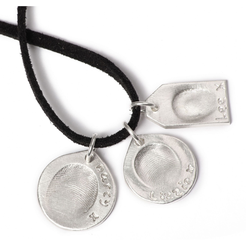 ‘Dog Tags’ are pendants for men and are perfect for the men in your life who cannot, or do not wear cufflinks, for work as they will always have their precious prints close to them. They are all supplied on a 20” black faux suede leather finished with sterling silver clasp as standard. If you would like a longer length, or an upgrade to a chain, please select in the top drop down menu.