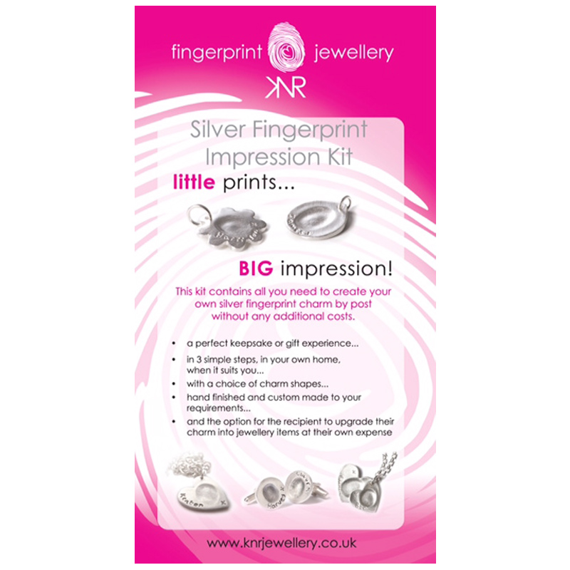 The Silver Fingerprint Impression Kit – this is our original Kit and enables you to capture one fingerprint impression. The return of one Standard Charm capturing your baby/child’s fingerprint and name/x is included in this kit. You can add your personalised details and charm shape choices on the order form. You can upgrade your charm, order additional items and request different finishes with either Kit, or even order again at a later date. Details will be included with your order. Each kit is suitable for one person. Watch our short ‘How to’ video and see how easy it is to use!