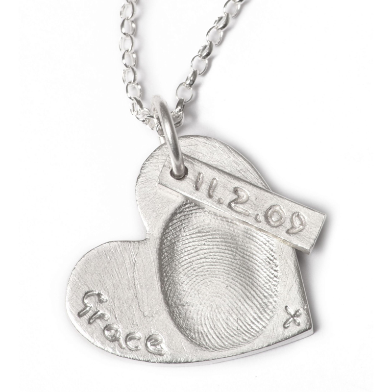 Tag Pendants are perfect for one child's print (especially if over 12months) as you have space on the tag for the name to be written without going into the fingerprint. You can even upgrade this tag to a bithstone tag. For a 'X'on the heart select 'Drawing/Writing and X'. Then enter name in 'Tag Inscription'.